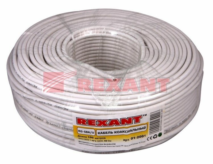 Кабель коаксиальный RG-58 A/U, 50 Ом, Cu/Al/Cu, 64%, 100м, INDOOR, белый REXANT