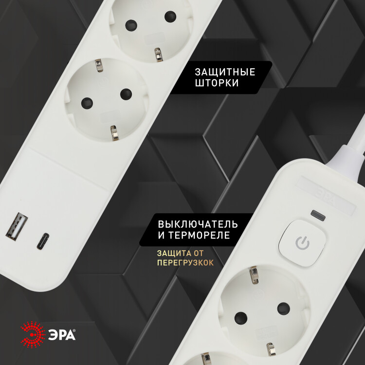 Сетевой фильтр ЭРА USF-4es-1,5m-2xUSBAC-W с базовой защитой с заземлением с выключателем 4 розетки+2xUSBA+C2,4A 1,5м 10А