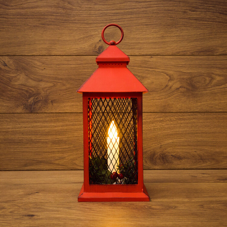 Декоративный фонарь со свечкой, красный корпус, размер 13,5x13,5x30,5 см, цвет ТЕПЛЫЙ БЕЛЫЙ