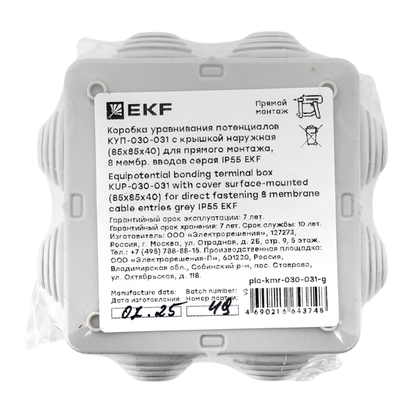 Коробка уравнивания потенциалов КУП-030-031 с крышкой наружная (85х85х40) для прямого монтажа 8 мембр. вводов серая IP55 EKF