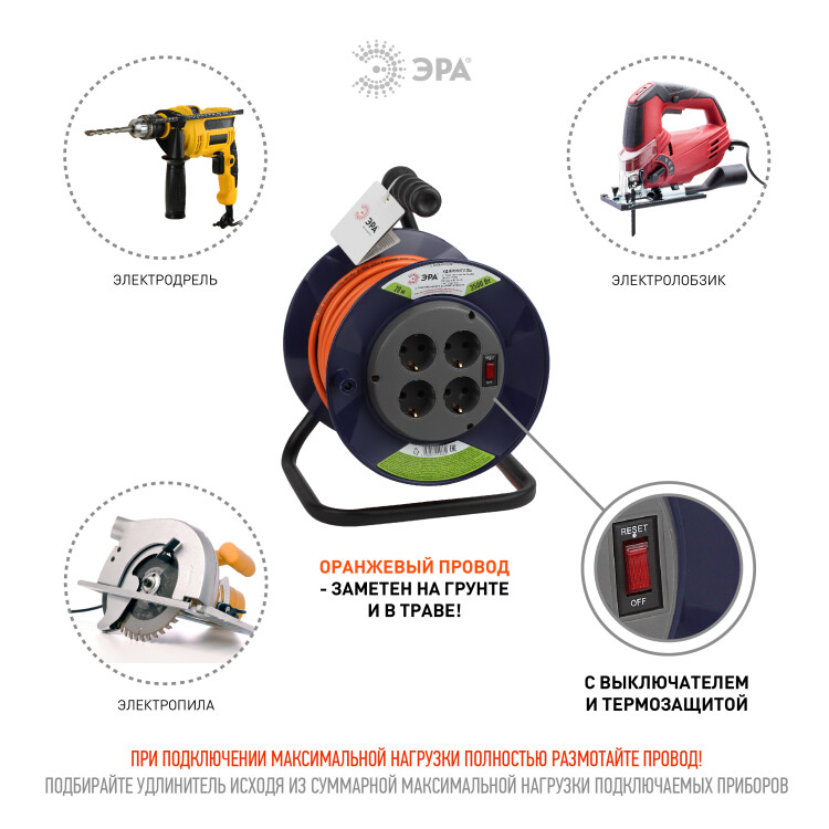 Удлинитель на катушке, 4 розетки, длина 20 м, 16А, ПВС 3х1.5 мм?, с/з, IP20, пластик, оранжевый, RPx-4es-3x1.5-20m