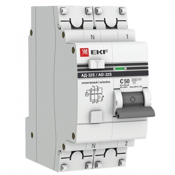 Автомат. выкл. дифф. тока 1-пол.+N 50А 100мА тип AC 4,5кА хар-ка C серия АД-32 (селективный) 1P+N 50А/100мА EKF PROxima