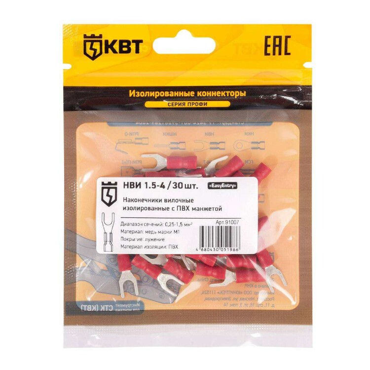 Наконечник кабельный вилочный изолированный НВИ 1.5–4 (30 шт) (КВТ)