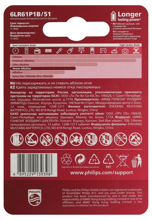 Батарейка алкалиновая "Крона" (6LR61;6F22;6KR61) 9V (1 шт.) Power
