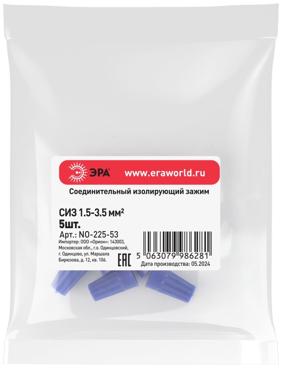 Соединительный изолирующий зажим ЭРА NO-225-53 СИЗ-2 (1,5-3,5 мм2) синий (упак. 5 шт.)