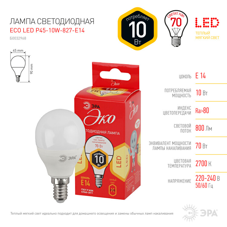 Лампочка светодиодная ЭРА RED LINE ECO LED P45-10W-827-E14 E14 / Е14 10Вт шар теплый белый свет