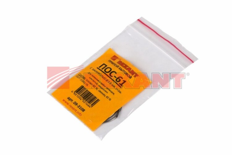 Припой с канифолью ПОС-61, 1м, O0,8мм, (олово 61%, свинец 39%), спираль, конверт REXANT