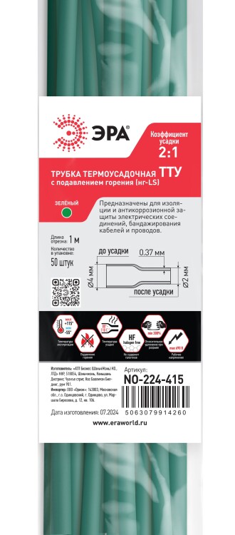 Термоусадочная трубка ЭРА NO-224-415 ТТУ нг-LS 4/2 зелёная в отрезках по 1 м. (упаковка 50 штук)