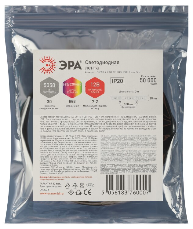 Светодиодная лента ЭРА LS5050 -7,2-30-12-RGB-IP20-1 year-5m (100/1800)