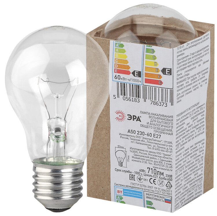 Лампа накаливания «груша» d50мм E27 60Вт 230В прозрачная ЭРА (Энергия света)