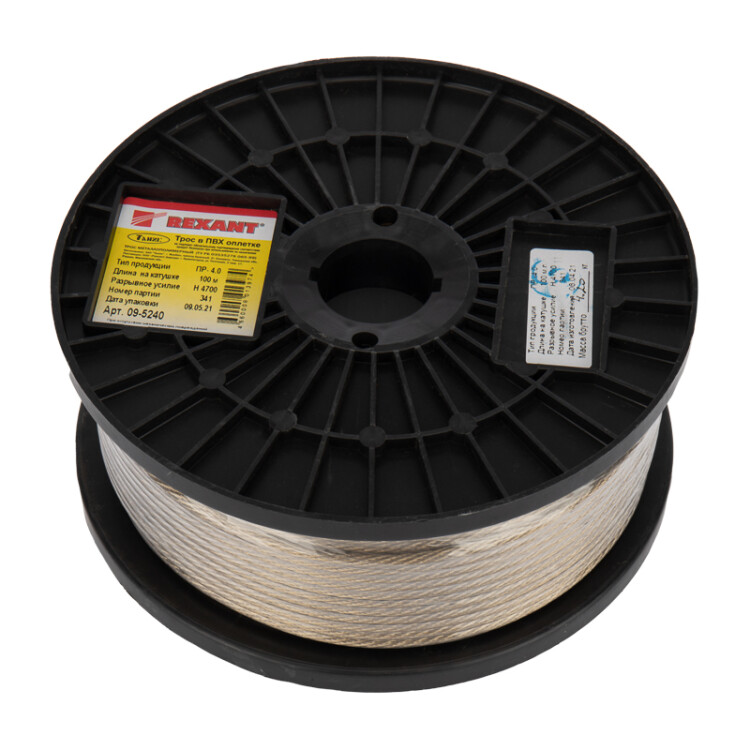 Трос стальной в ПВХ оплетке d=4,0мм, прозрачный (буxта 100м) REXANT
