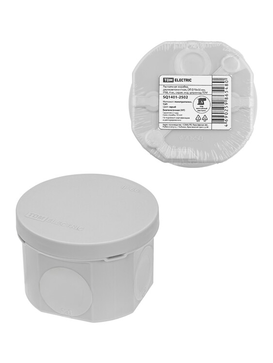 Распаячная коробка, двухкомпонентная, ОП D70х50 мм, IP66, 4 вх., серая, инд. штрихкод TDM