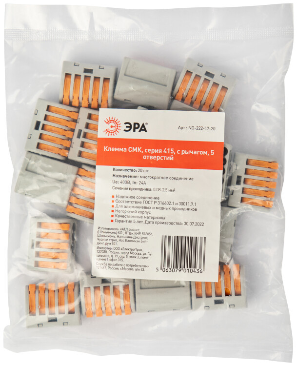 Клемма ЭРА серия 415 с рычагом 5 отверстий 0.08-2.5мм2 упаковка 20 шт