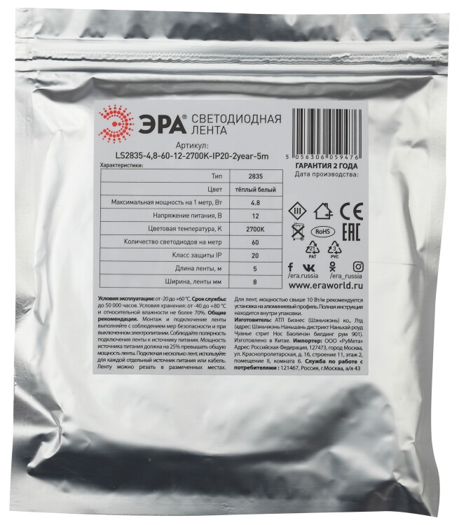 ЭРА Лента светодиодная LS2835-4,8-60-12-2700K-IP20-2year-5m (140/4200)