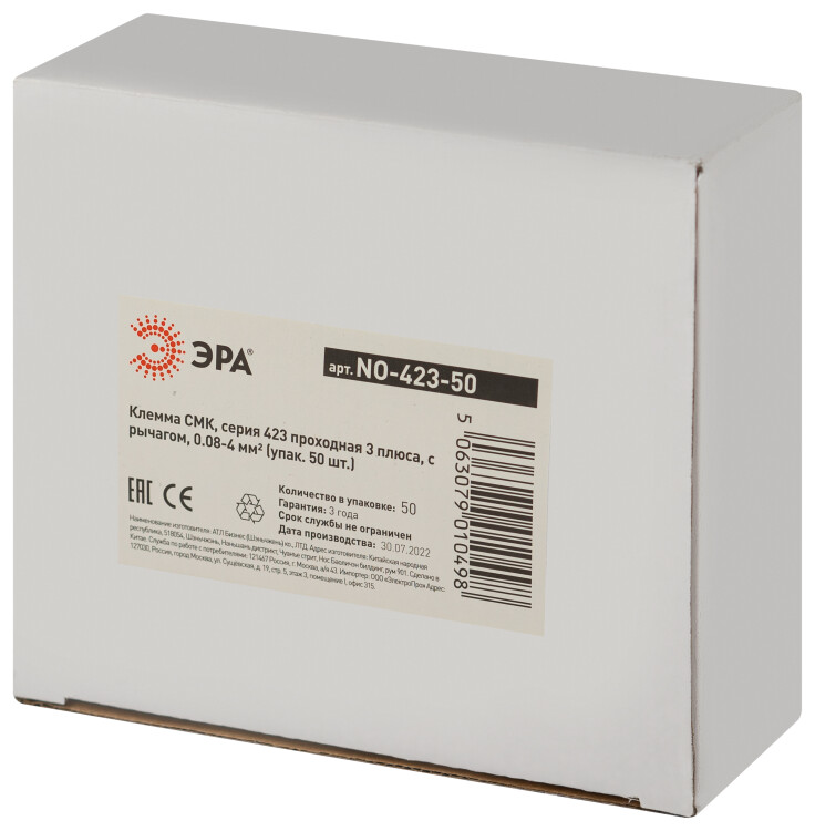 Клемма ЭРА серия 423 проходная 3 плюса с рычагом 0.08-4мм2 упаковка 50 шт