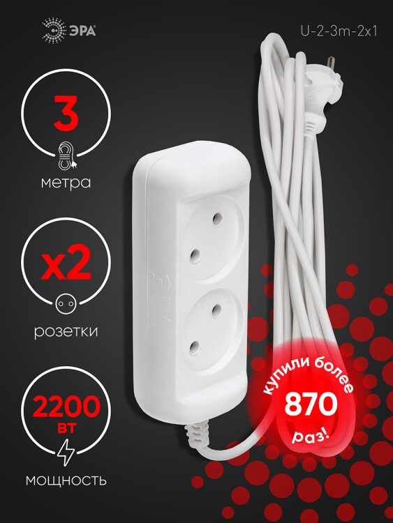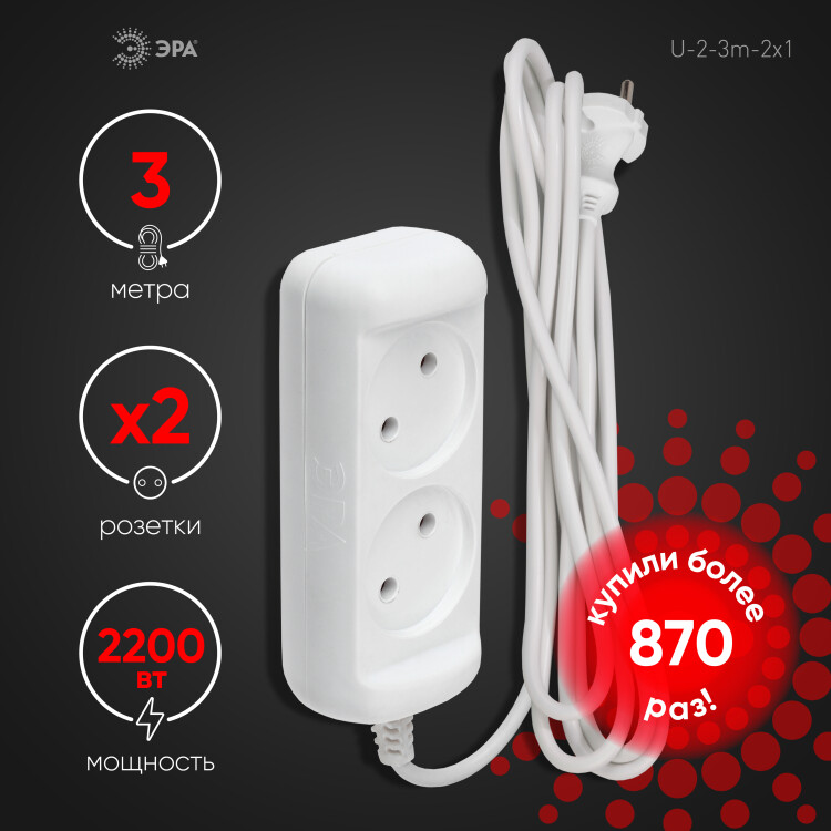 Удлинитель электрический ЭРА U-2-3m-2x1 без заземления 2 розетки 3м ПВС 2x1мм2 10А