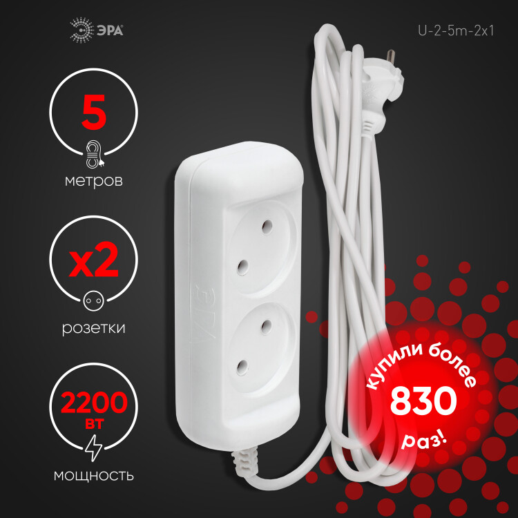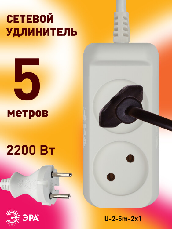 Удлинитель электрический ЭРА U-2-5m-2x1 без заземления 2 розетки 5м ПВС 2x1мм2 10А
