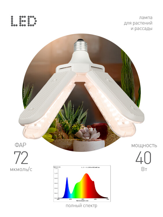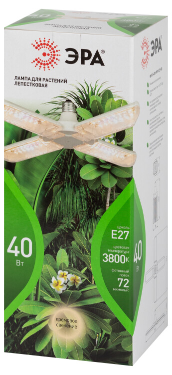 Фитолампа для растений светодиодная ЭРА GREEN LINE ФИТО-40W-PFR-E27-GR 4-х лепестковая полного спектра 40 Вт Е27