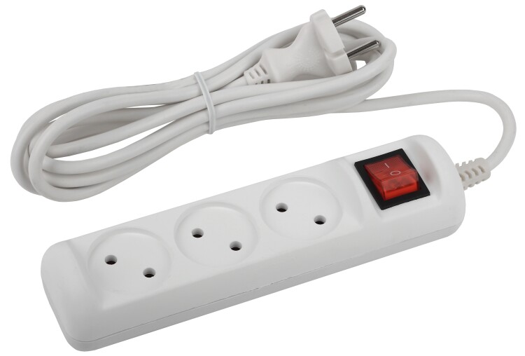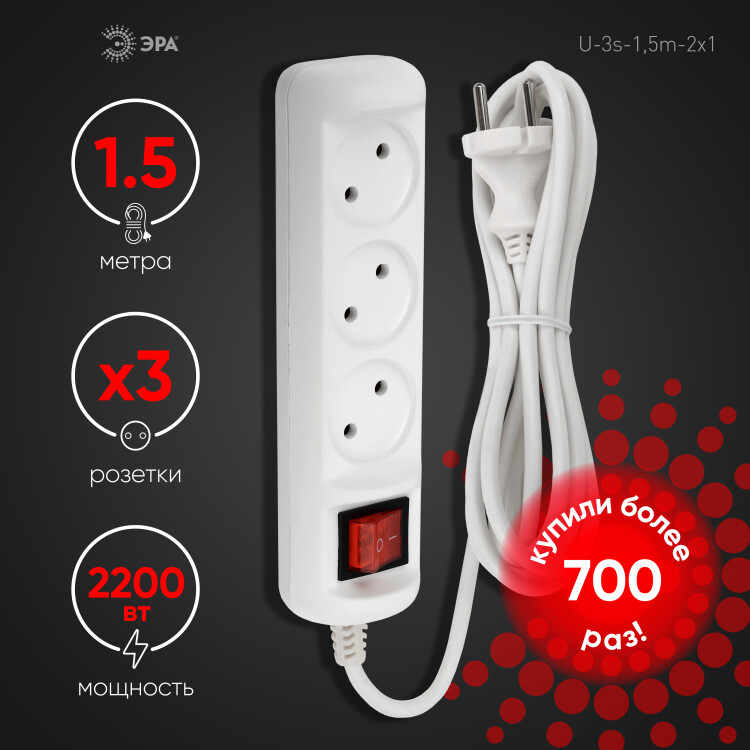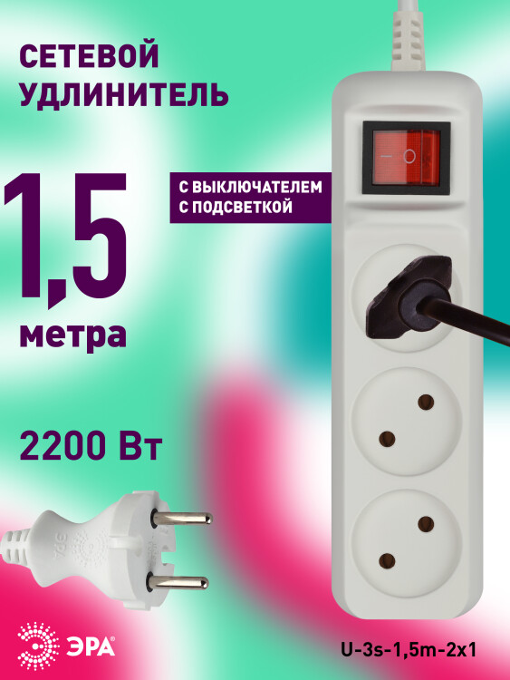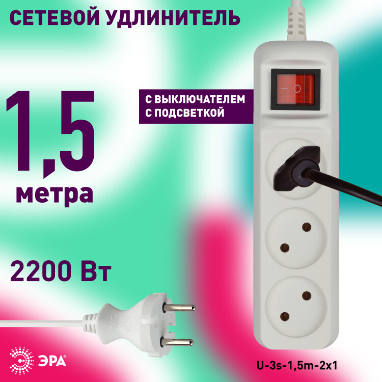 Удлинитель электрический ЭРА U-3s-1,5m-2x1 без заземления c выключателем 3 розетки 1,5м ПВС 2x1мм2 10А