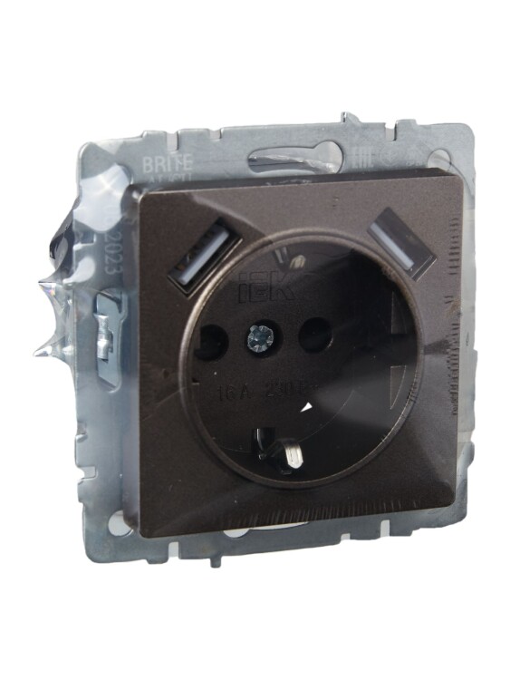 Розетка 2P+E с защитными шторками 16А с USB A+A 5В 2,1А РЮш10-1-БрТБ темная бронза BRITE