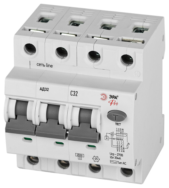 АВДТ 4,5кА ЭРА PRO D32E4C32АC30P АД-32 электронное 3P+N C32 30мА тип АC защита 230В