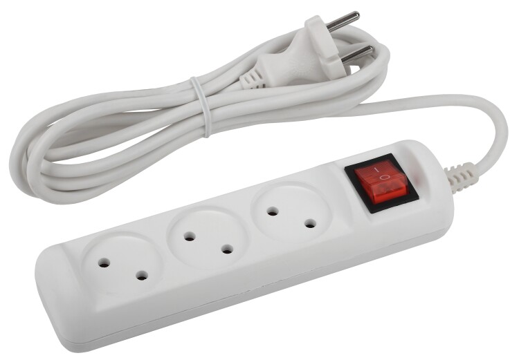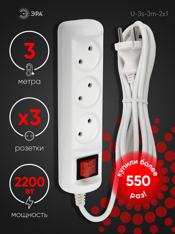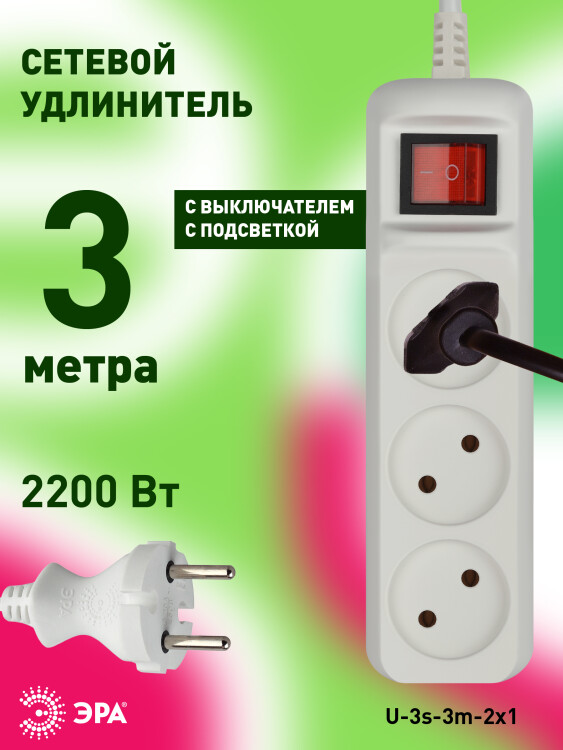 Удлинитель электрический ЭРА U-3s-3m-2x1 без заземления c выключателем 3 розетки 3м ПВС 2x1мм2 10А