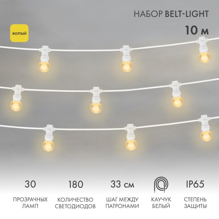 Набор Белт-Лайт 10 м, белый каучук, 30 ламп, цвет Желтый, IP65, соединяется