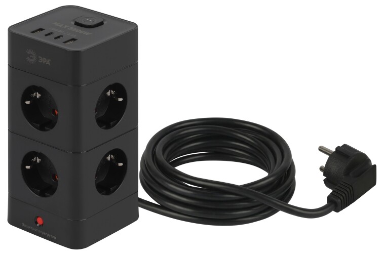 Сетевой фильтр ЭРА TWR-8es-1,5m-4USB-B башня с защитой заземлением с выключателем 8 розеток+4xUSBA+C 1,5м 16А черный