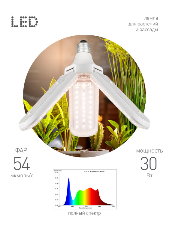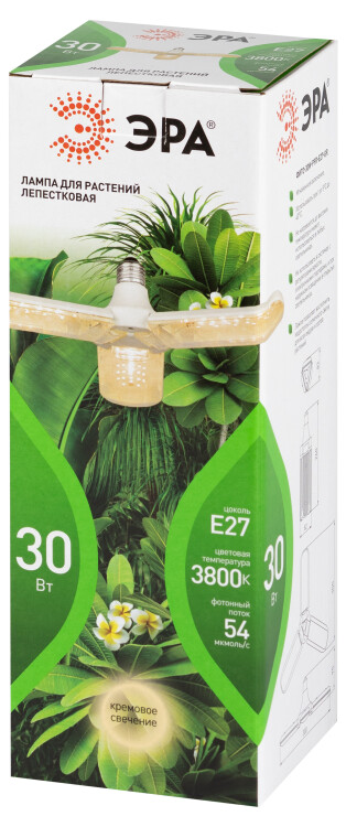 Фитолампа для растений светодиодная ЭРА GREEN LINE ФИТО-30W-PFR-E27-GR 3-х лепестковая полного спектра 30 Вт Е27