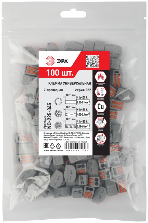 Клемма ЭРА NO-225-345 универсальная 222-412 с рычагами 2-проводная 0.08-2.5/4 мм2 (упаковка 100 шт.)