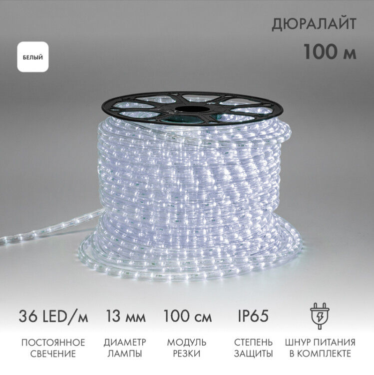 Дюралайт LED двуxжильный 230В 13мм 36 LED/м БЕЛЫЙ постоянное свечение модуль 1м буxта 100м NEON-NIGHT