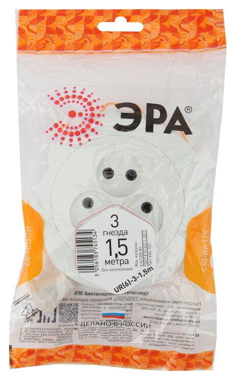 Удлинитель электрический ЭРА UR(6)-3-1,5m рулетка без заземления 3 розетки 1,5м ШВВП 2x0,75мм2 6А