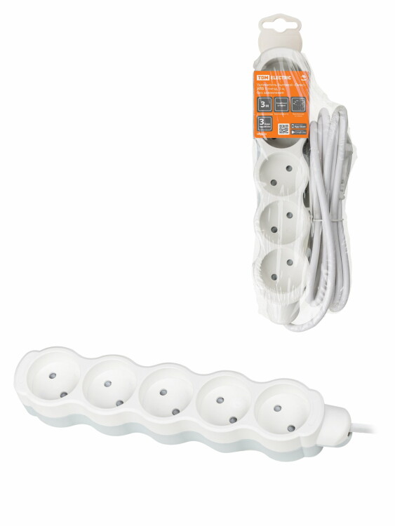 Удлинитель бытовой "Люкс" УЛ5 5 гнезд, 3м, б/з, с з/ш, ПВС 2х0,75 мм2 10А/250В бело-серый TDM