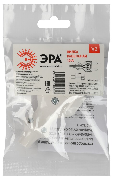 Вилка кабельная прямая, пластик, IP20, 6А, б/з, белая, V2