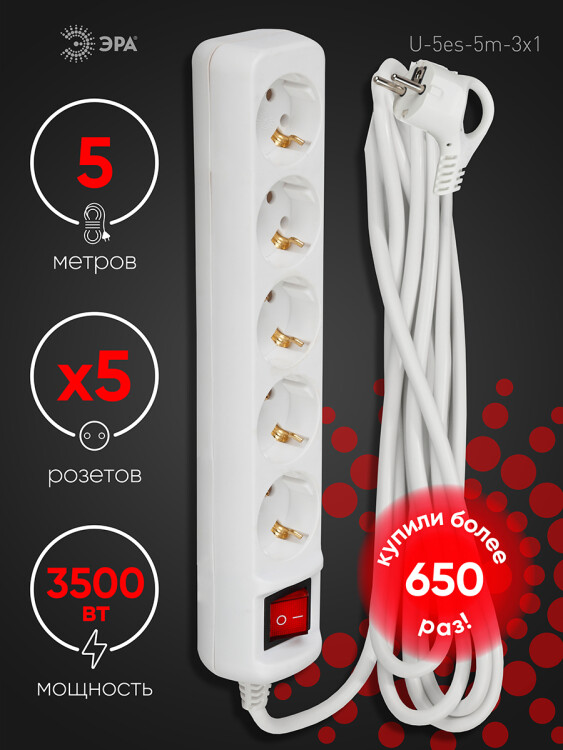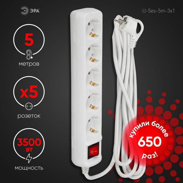 Удлинитель электрический ЭРА U-5es-5m-3x1 с заземлением с выключателем 5 розеток 5м ПВС 3x1мм2 16А