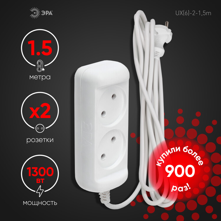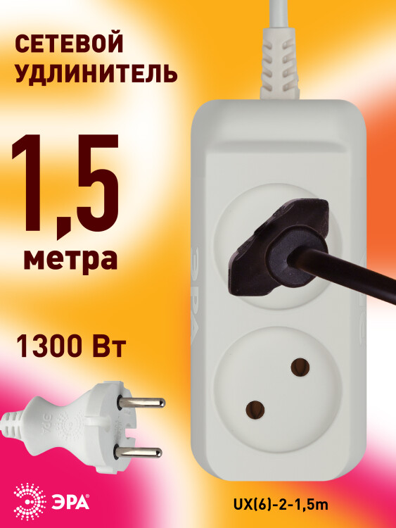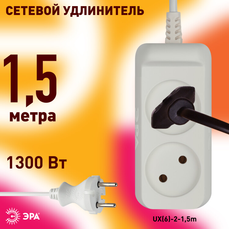 Удлинитель электрический ЭРА UX(6)-2-1,5m без заземления 2 розетки 1,5м ПВС 2x0,75мм2 6А белый