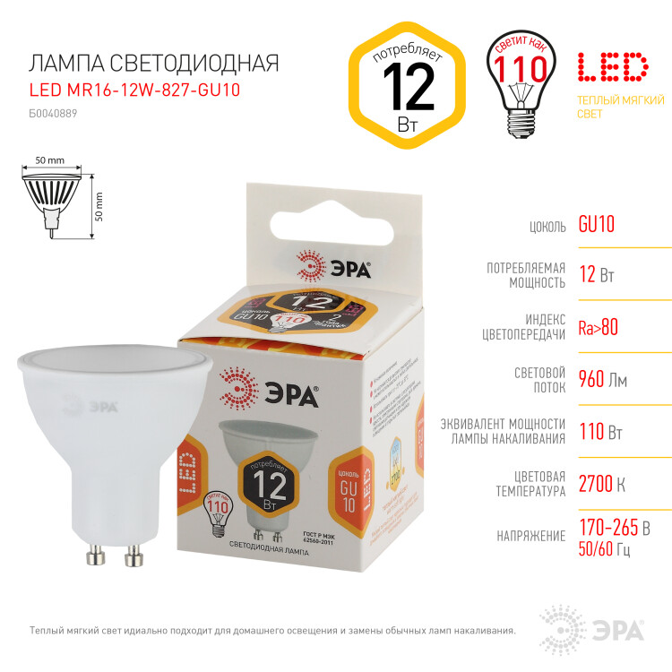 Лампочка светодиодная ЭРА STD LED MR16-12W-827-GU10 GU10 12Вт софит теплый белый свет