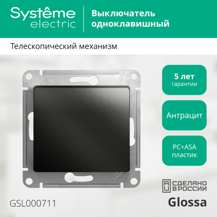 Выключатель 1 клавишный 10А антрацит Glossa