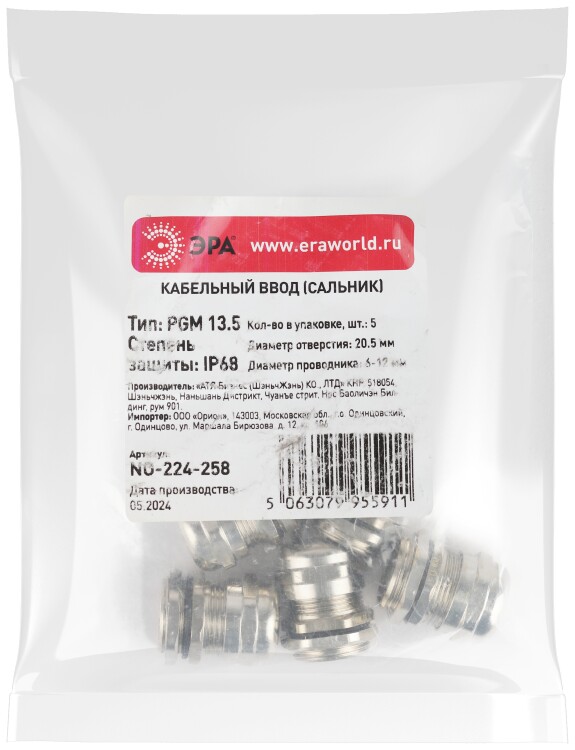 Кабельный ввод сальник ЭРА NO-224-258 латунный PGM 13.5 (d отв.20.5 мм / d провод.6-12 мм) IP68 (упаковка 5 штук)