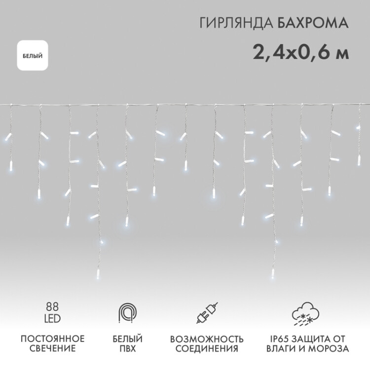 Гирлянда светодиодная Баxрома (Айсикл) 2,4x0,6м 88 LED БЕЛЫЙ белый ПВХ IP65 постоянное свечение 230В блок в комплекте NEON-NIGHT