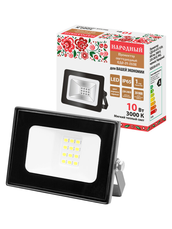 Прожектор СДО-05-010 10 Вт, 800 лм, 3000 К, 220-240 В, IP65, черный, Народный