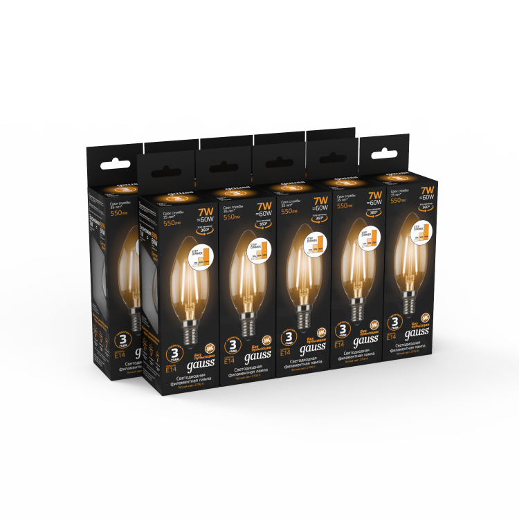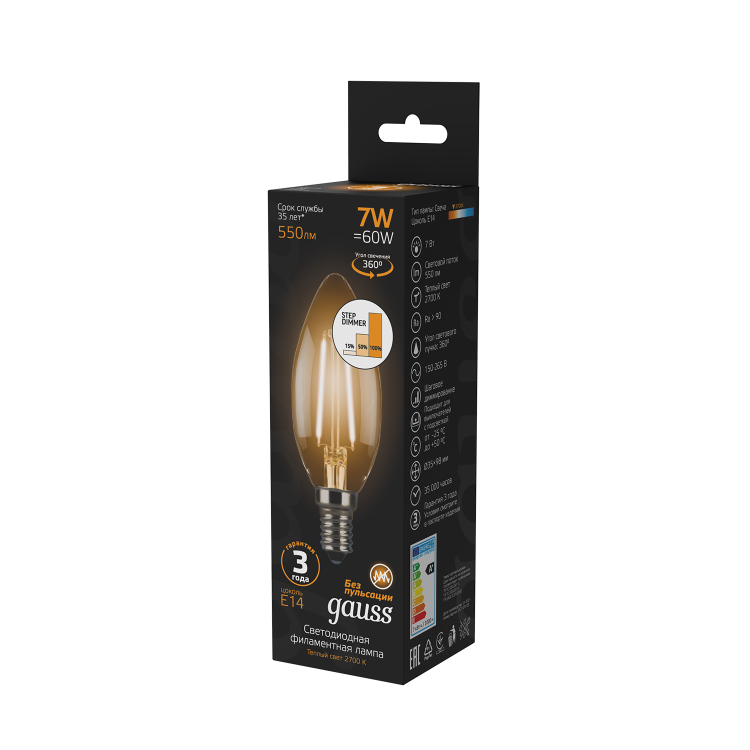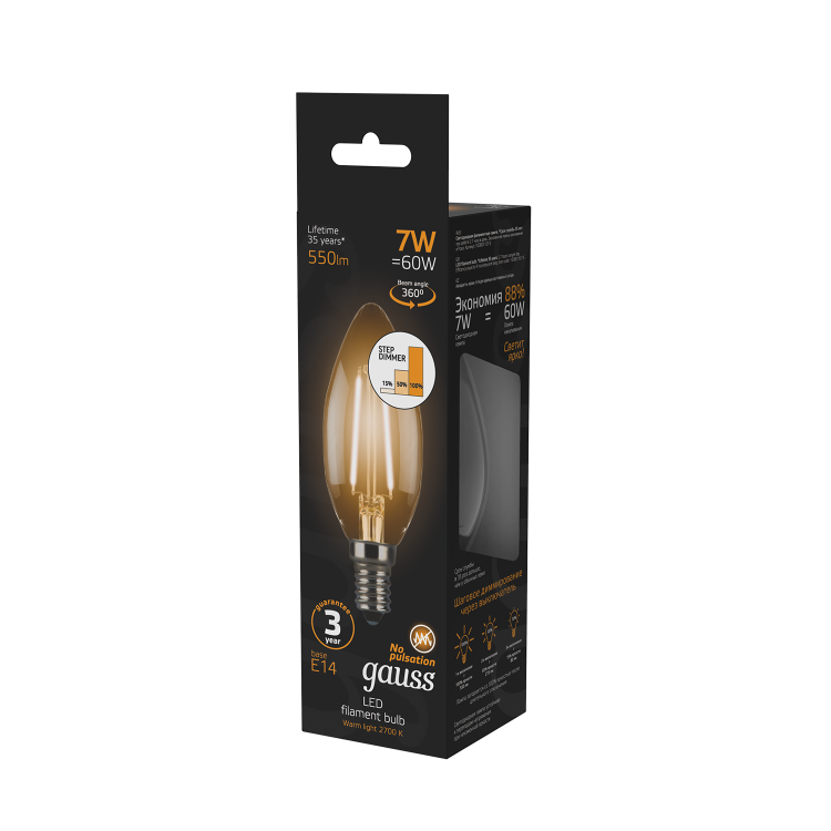 Лампа светодиодная 7 Вт 230В Е14 Filament свеча-пошаговое диммирование, тёплый 2700К