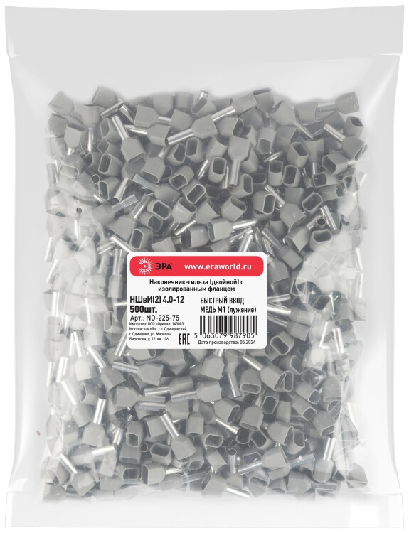 Наконечник-гильза ЭРА NO-225-75 (двойной) НШвИ(2) 4,0-12 с изолированным фланцем (упаковка 500 шт.)