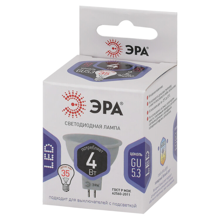 Лампочка светодиодная ЭРА STD LED MR16-4W-860-GU5.3 GU5.3 4Вт софит холодный дневной свет