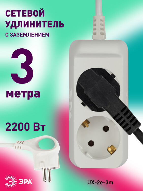Удлинитель электрический ЭРА UX-2e-3m с заземлением 2 розетки 3м ПВС 3x0,75мм2 10А