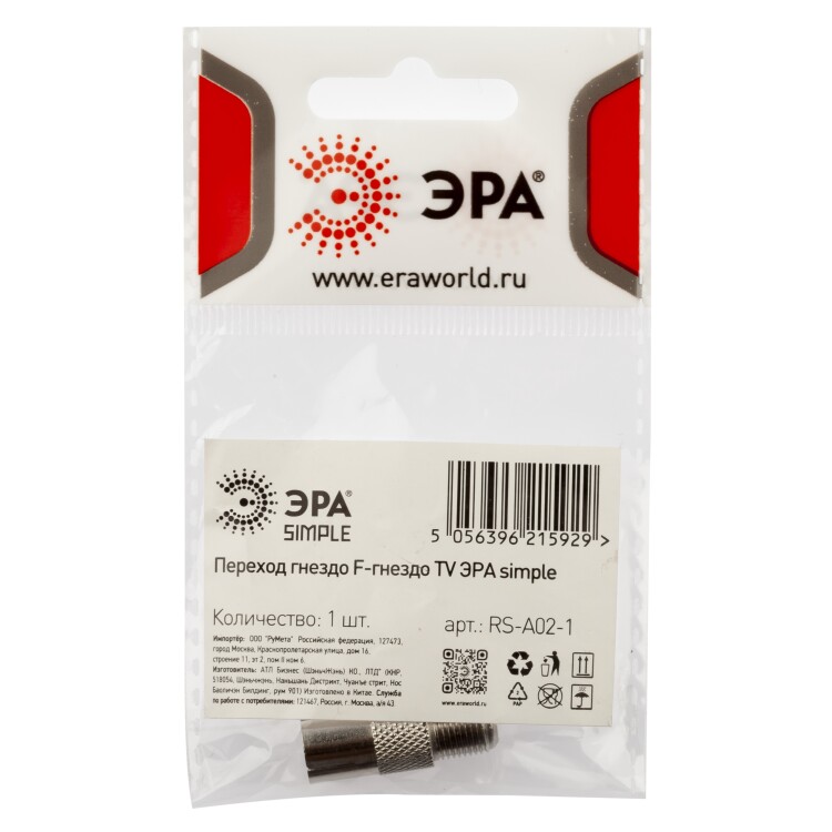 Переходник ЭРА SIMPLE гнездо F-гнездо TV упаковка 1 шт.