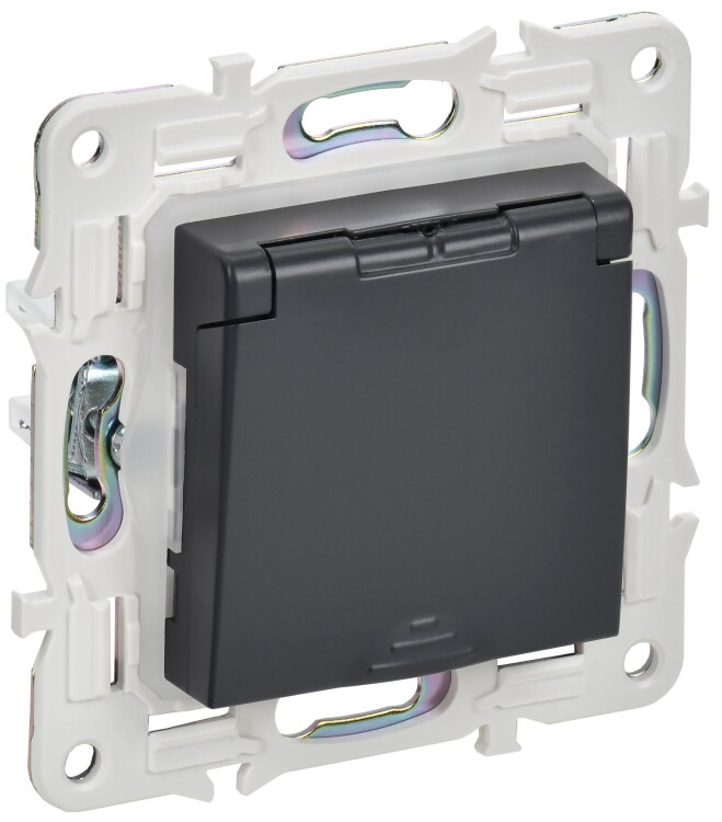 Розетка 1-местная с заземлением с защитными шторками и крышкой 16А IP44 SK-R11T титан SKANDY