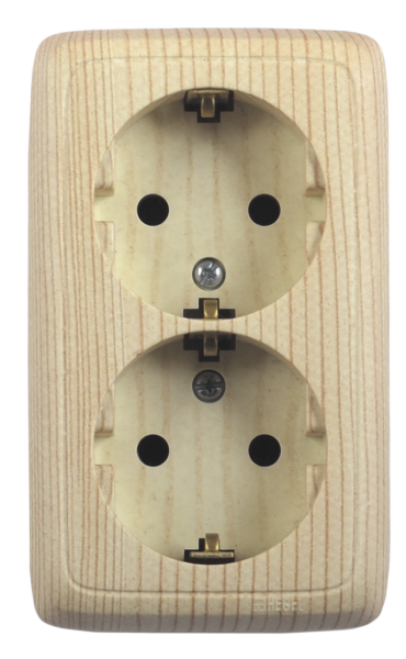 РА16-151-02 Розетка открытой установки, двухместная, с заземляющим контактом, цвет сосна