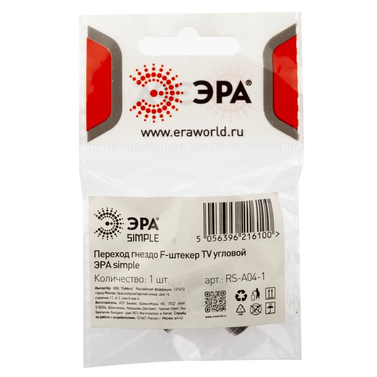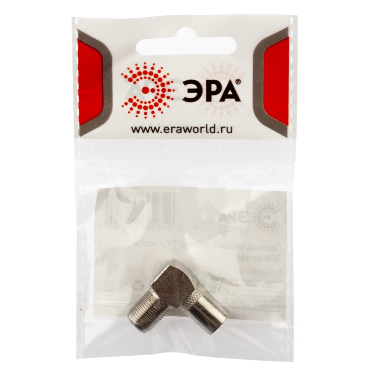 Переходник ЭРА SIMPLE гнездо F-штекер TV угловой упаковка 1 шт.