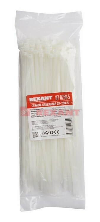 Стяжка кабельная нейлоновая 250x4,8мм, белая (100 шт/уп) REXANT